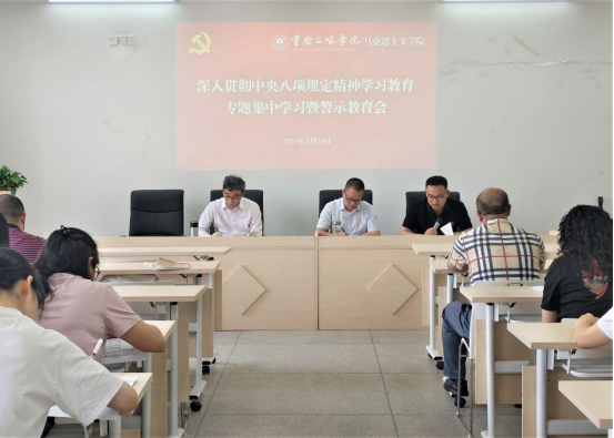 5月29日下午,我院在博学楼3栋424会议室召开深入贯彻中央八项规定精神学习教育专题集中学习暨警示教育会。会议由学院党总支书记秦勤主持,全体教职工参会。