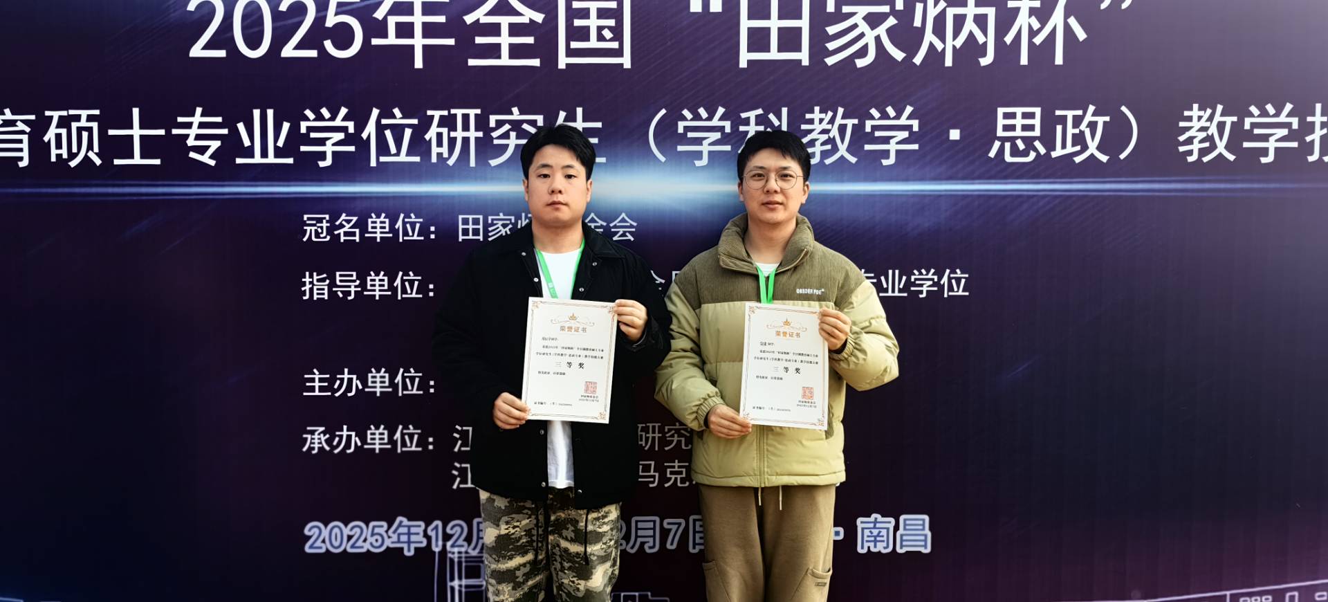 12月5日至7日,2025年全国“田家炳杯”全日制教育硕士专业学位研究生学科教学(思政)教学技能大赛决赛在江西师范大学举办。经过与各院校优秀选手的同台竞技,我院研究生胡果、周虹宇分别荣获三等奖。